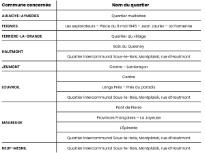 La commune d’Aulnoye-Aymeries est réentrée dans la géographique prioritaire après une sortie en 2015. Les deux nouveaux quartiers sont le quartier multisites d’AulnoyeAymeries et le quartier centre-ville de Louvroil. Des quartiers politique de la ville existants ont vu leur périmètre s’agrandir notamment à Maubeuge et Hautmont.